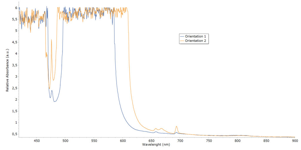 Az első és második orientáció esetében a polarizációs állapot változtatása jelentős spektrális különbségeket eredményezett. Ezek az eltérések különösen a látható tartomány bizonyos részein (pl. ~460–500 nm, illetve ~580–610 nm) jelentkeznek, ami arra utal, hogy az adott hullámhossztartományokban az abszorpciós folyamatok erősen irányfüggőek.
