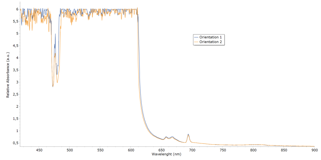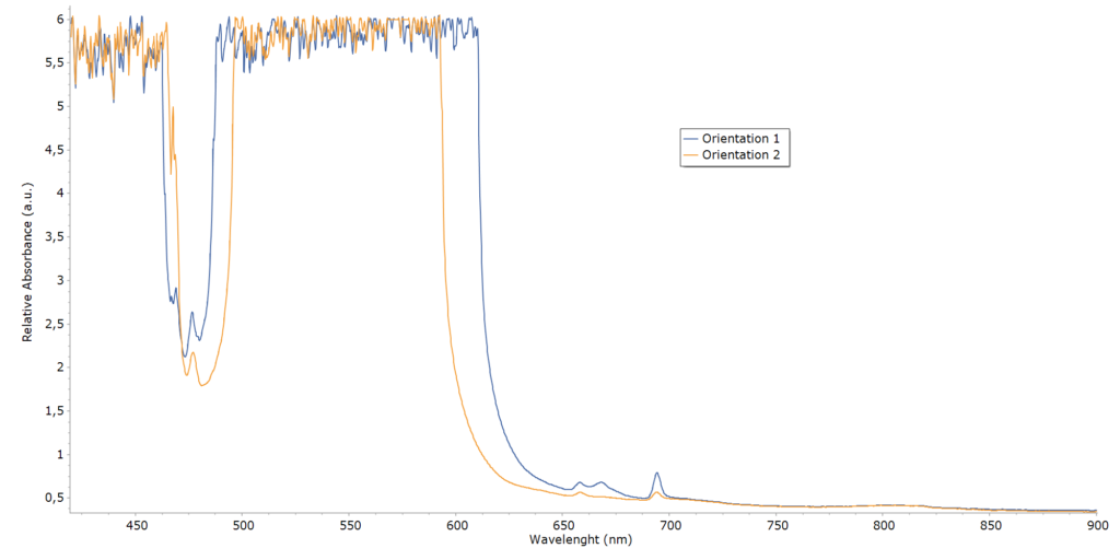 A két spektrum között csak minimális eltérés figyelhető meg, ami arra utal, hogy ebben az orientációban a polarizációfüggő abszorpció jelentősen gyengébb. A spektrumok közel fedésben vannak, ami arra utal, hogy ebben az orientációban a vizsgált optikai tengely mentén az abszorpció polarizációfüggése minimális.