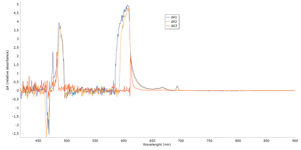 A különbségi spektrumok értelmezése során figyelembe vettük a mérési zaj szintjét. Azok a hullámhossztartományok, ahol a ΔA érték a zajszinttel összemérhető volt, nem kerültek értelmezésre.